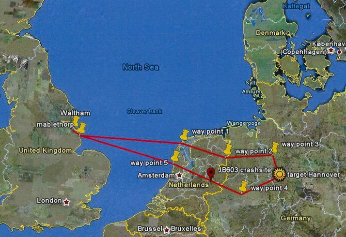 The fifteen Lancasters from 100 squadron would be in the second phase, due over the target at 2150 hrs. They would route over the North Sea and cross the Dutch coast to a waypoint north of Hannover. Then they would approach the target area, head southwest, and cross back over the Netherlands.